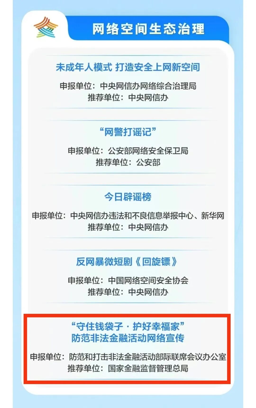 由防范和打击非法金融活动部际联席会议办公室申报的“守住钱袋子·护好幸福家”(防范非法金融活动网络宣传)入选2025年网络文明建设优秀案例。