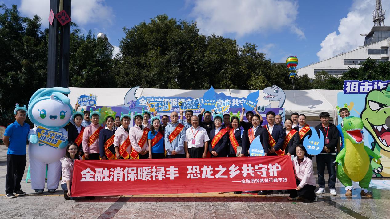 在禄丰金融监管支局指导下,中国太保产险禄丰支公司联合辖区内6家银行保险机构,于10月26日禄丰恐龙节期间,成功举办“金融消保威楚行·禄丰站”主题宣传活动。活动巧妙借禄丰恐龙节文旅热度契机,以“金融消保暖禄丰,恐龙之乡共守护”为口号,将金融知识普及与本土恐龙文化IP深度融合,通过沉浸式场景、互动式体验创新开展消费者权益保护宣传,让消保知识随恐龙文化“出圈”。活动现场亮点纷呈,3米高的“恐龙主题消保知识墙”成为打卡热点,